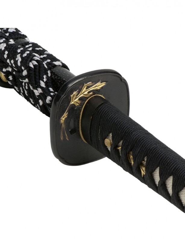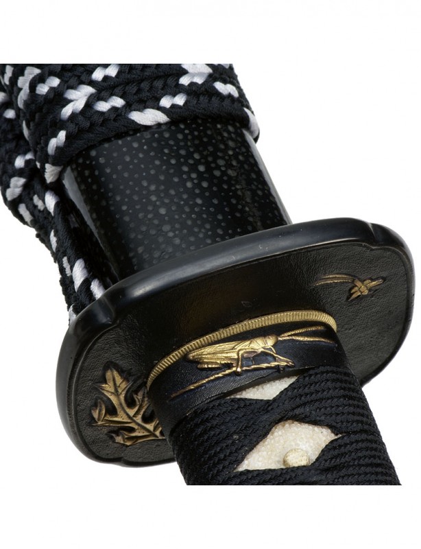 Son style Shinogi-Zukuri, sans gorge (Bo-Hi), offre un équilibre parfait entre puissance et précision, idéal pour la pratique du tameshigiri comme pour l’exposition. La poignée (tsuka), longue de 29 cm, est habillée de peau de raie véritable (same) recouverte d’un tressage en soie noire Hineri-Maki, fixée par des inserts en papier triangulaires (hishigami) pour une tenue parfaite. La saya en bois laqué noir brillant (Kuroro), agrémentée d’extrémités en corne de buffle, ajoute une touche de raffinement sobre.