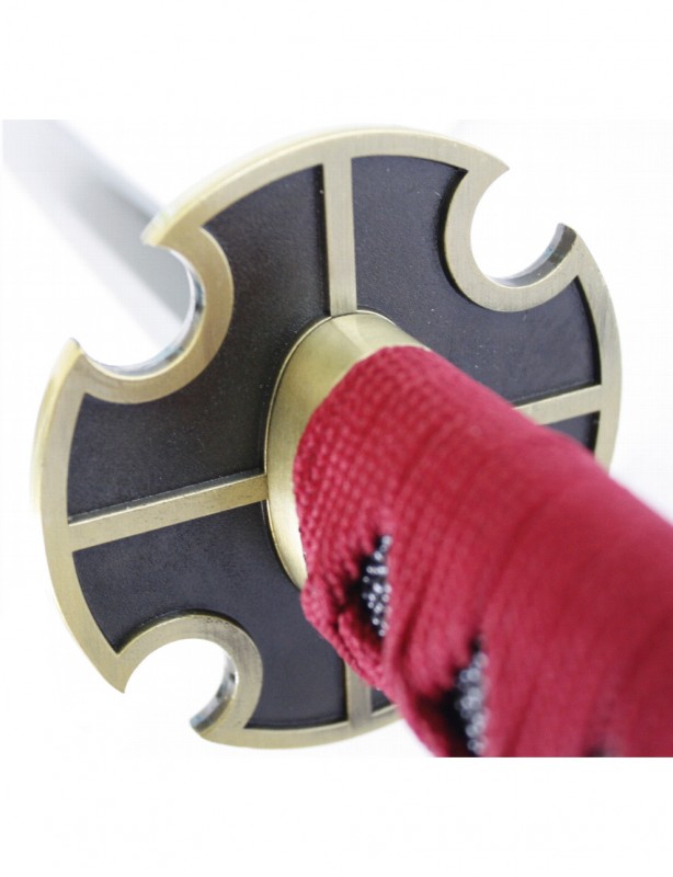 Le saya (fourreau) est conçu en bois laqué rouge, avec un insert en peau de raie synthétique noire pour une touche d’authenticité. Ce design distinctif renforce l’esthétique unique du Sandai Kitetsu, fidèle à l’anime.