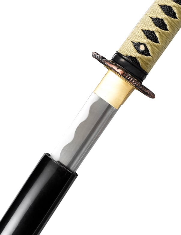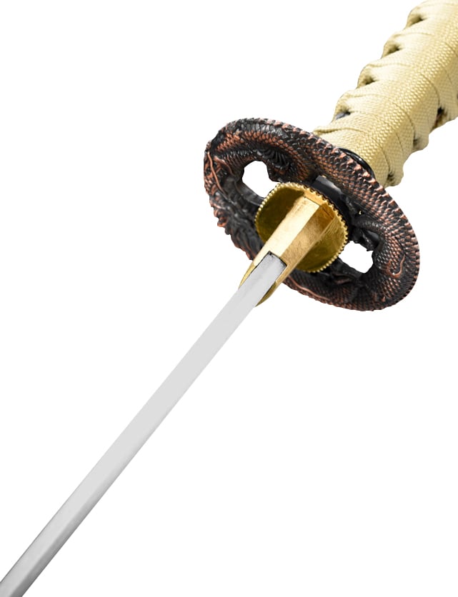 Le katana Tatsu no (竜の太刀) est une œuvre d’art forgée à partir d’acier 1045, offrant une combinaison parfaite de force et de finesse. La lame maru tranchant est conçue pour des coupes précises et efficaces, idéale pour les démonstrations et les pratiques de coupe sur des cibles tendres. Le ito doré ajoute une touche d’élégance et de distinction, reflétant la lumière de manière captivante.