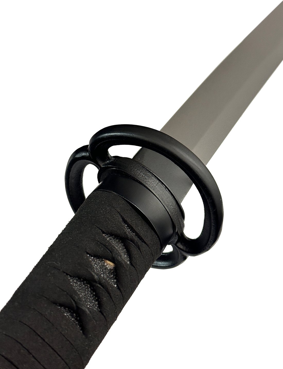 Pas de menuki et Tsuka monté avec 2 Goupilles ( Menuki ) - Enroulement : Cordon nubuck noir ( Cuir ) avec tressage traditionnel Takatemaki, garantissant une durabilité accrue.