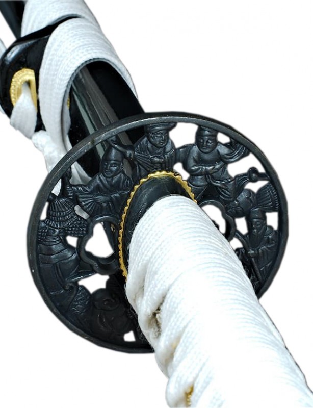 Sabre au motifs samouraï (Tsuba, fuchi-kashira), le samouraï 侍 est un guerrier japonais au service de son pays. Le samouraï est éduqué dès son plus jeune âge à une discipline basée sur des principes de vie et codes de conduite (Le bushido – La voie du guerrier).
