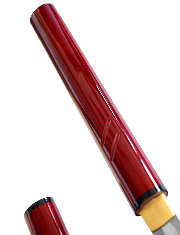 Cette réplique fidèle au film restitue ce paradoxe fascinant : l’apparente simplicité d’un bâton rouge, la présence d’une lame tranchante prête à répondre aux exigences des passionnés de sabre japonais, de collection et d’initiation à la coupe sur objet tendre. Son profil droit mu sori (無反り) renforce la signature visuelle de l’arme iconique, immédiatement reconnaissable par les amateurs de cinéma nippon.