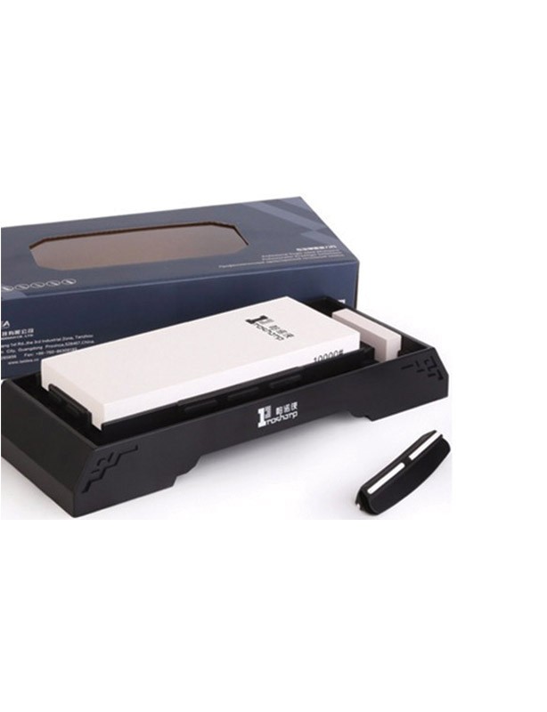 Ensemble comprenant une pierre à affuter de grain 10000, un guide d'affutage et une poire pour humidifier la pierre.