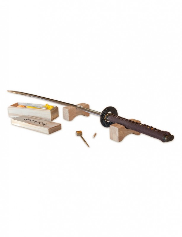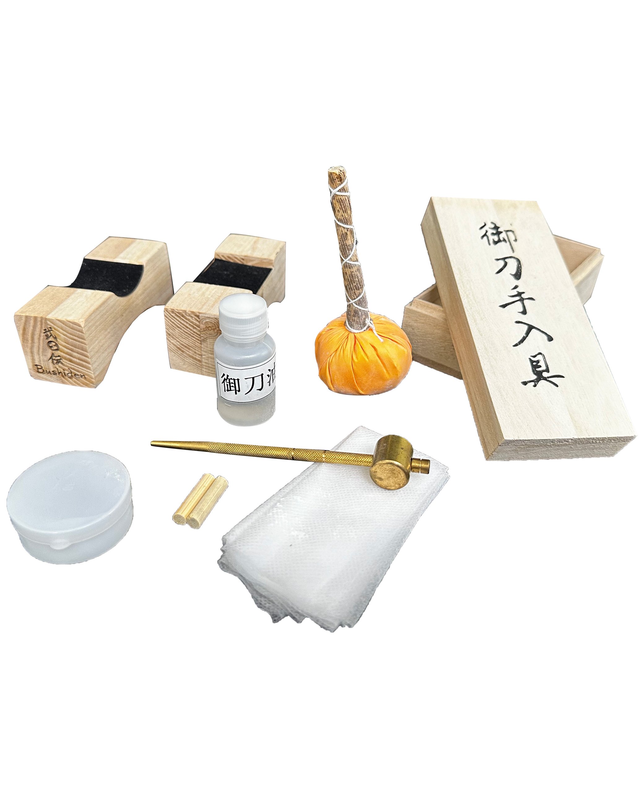Huile pour lame, , chiffon d’entretien, une boule de poudre pour polir la lame, une alène de cuivre ainsi qu’un petit marteau, 2 mekugi de rechange. Emballage coffret bois