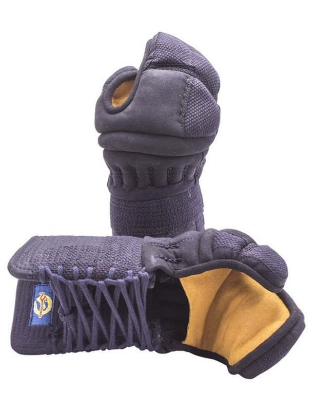 Pair de Kote, gants pour le Kendo, l’éxtérieur a été confectionné avec du tissu molletonné 100 % coton et cuir synthétique de grande qualité, tout est coloré en bleu indigo, et rembourrée avec de la laine synthétique pour une meilleure protection des mains contre les impacts ; la partie inférieur, sur la zone des phalanges de la main, le tissu est en cuir synthétique de couleur naturel. Une partie de la confection a été faite à la main. Sur la zone de l’avant-bras, la fermeture est faite à travers de cordon réglable, aussi de couleur bleu indigo