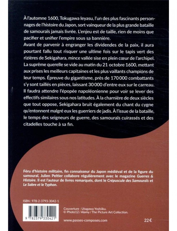 À l’automne 1600, Tokugawa Ieyasu, l’un des plus fascinants personnages de l’histoire du Japon, sort vainqueur de la plus grande bataille de samouraïs jamais livrée. L’enjeu est de taille puisqu’il ne s’agit rien moins que de l’empire tout entier, enfin pacifié. Le suzerain de la maison Tokugawa sera le troisième des Unificateurs du pays. Avant de parvenir à engranger les dividendes de la paix, il aura pourtant fallu tout risquer une ultime fois sur le tapis vert des rizières de Sekigahara, mince vallée sise en plein coeur de l’archipel. La suprême querelle se vide au matin du 21 octobre 1600, mettant aux prises les meilleurs capitaines et les plus vaillants champions de leur temps. Épreuve du gigantisme, près de 170 000 combattants s’y sont taillés en pièces, laissant 30 000 d’entre eux sur le carreau. Il faudra attendre l’épopée napoléonienne, deux siècles plus tard, pour voir se lever des effectifs similaires sous nos latitudes. À la charnière de deux siècles que tout oppose, Sekigahara bruit également du chant du cygne qu’entonnent malgré eux les guerriers de jadis. A l’issu de la bataille, le temps des seigneurs de guerre, des samouraïs et des citadelles est révolu.