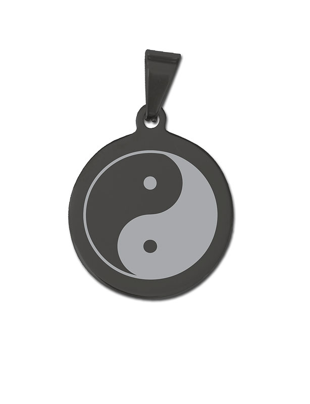 Médaille ronde en acier inoxydable anodisé noir, avec motif « Yin yang » sur le recto.
