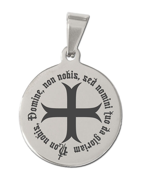 Médaille ronde en acier inoxydable argenté, avec la phrase « Non nobis » et la croix des templiers, gravées au laser (couleur gris foncé).
