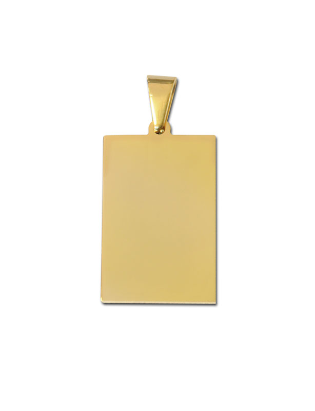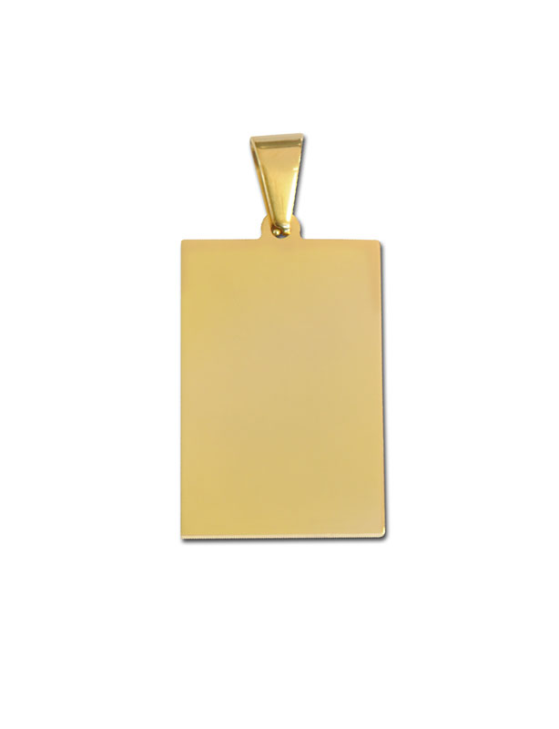 Pendentif rectangulaire en acier inoxydable doré, à personnaliser avec un visuel et un texte (gravure laser, aspect gris foncé).