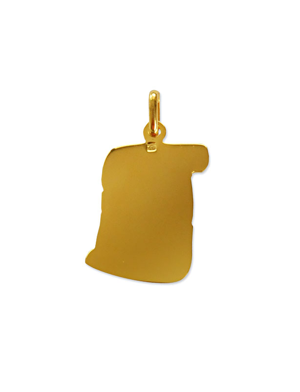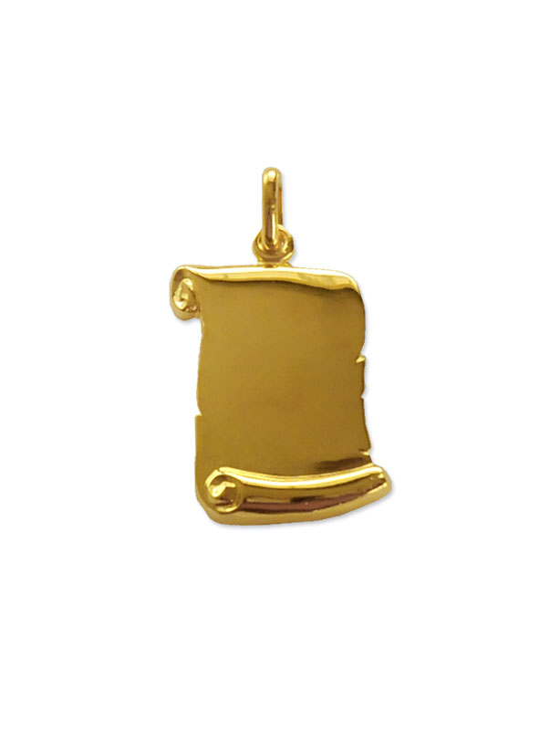 Médaille en forme de parchemin en plaqué or, à personnaliser avec un visuel et un texte (gravure laser, aspect gris foncé).