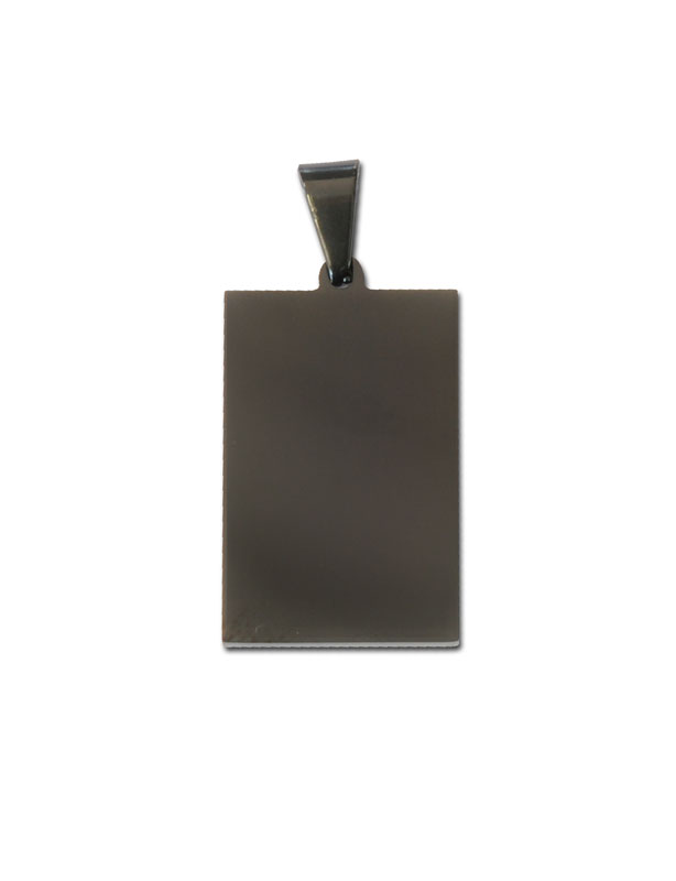 Pendentif rectangulaire en acier inoxydable anodisé noir, à personnaliser avec un visuel et un texte (gravure laser, aspect gris clair).