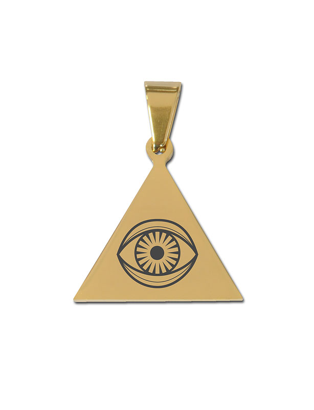Pendentif Triangle équilatéral doré en inox, avec un œil gravé sur le recto.