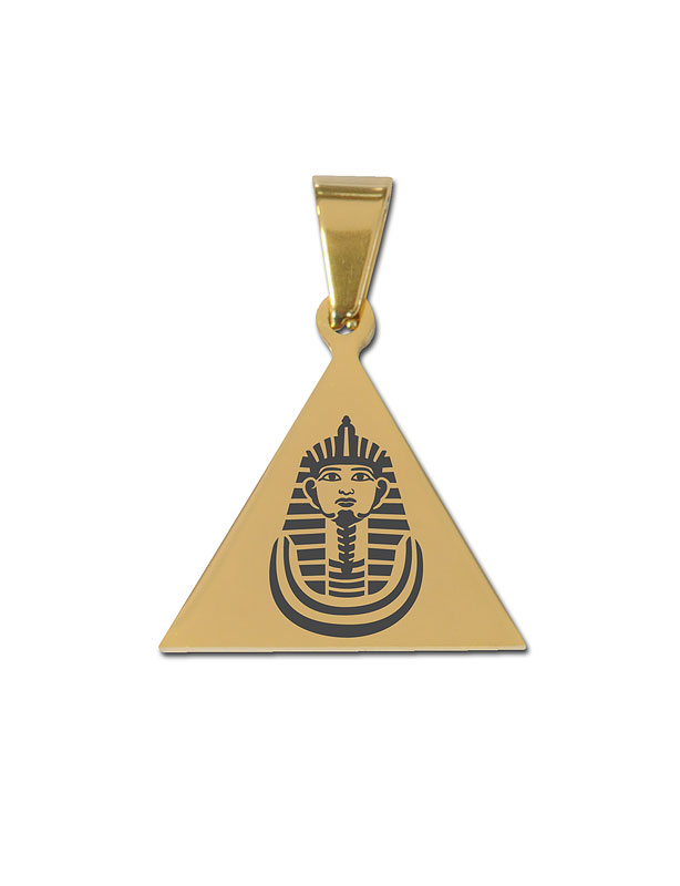 Pendentif Triangle équilatéral doré en inox, avec le masque de Psouménès gravé sur le recto.