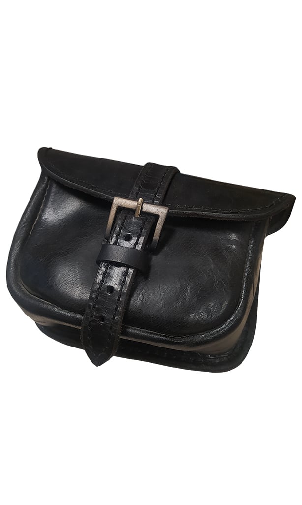 Petit sac en cuir noir avec double passant à la ceinture, deux rabats intérieur pour ne pas que vos affaires se renversent.