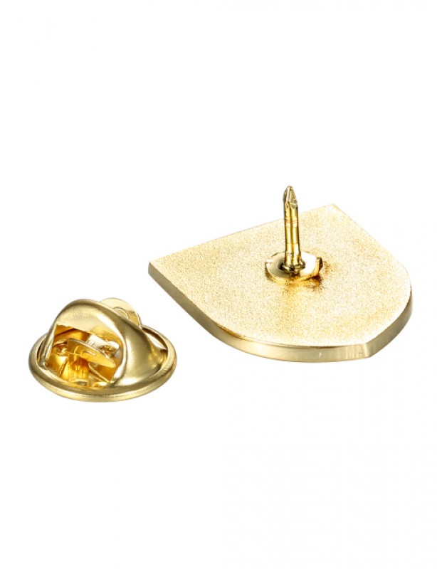 Pin's (épinglette) en métal doré, avec une croix templière pattée droite rouge sur fond blanc.
