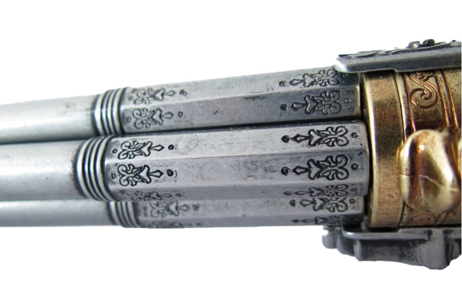 Reproduction de pistolet à étincelle avec 4 pistolets rotatifs, en métal et avec des poignées en plastique imitation ivoire, avec mécanisme de simulation de chargement et de cuisson.