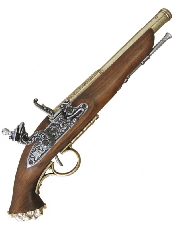Reproduction du pistolet Flintlock en bois et en métal avec un mécanisme de simulation de chargement et de tir.