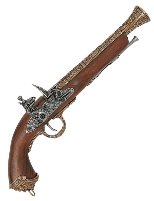Le pistolet Flintlock a été une avancée majeure dans le développement des armes à feu. Contrairement aux pistolets à mèche, le mécanisme à silex produit une étincelle qui enflamme la poudre à canon, permettant un tir plus rapide et plus efficace. Cette arme était généralement utilisée pour un tir unique, car la méthode de rechargement manuelle après chaque coup était lente. Les combattants devaient souvent se battre avec leur sabre ou utiliser leur pistolet comme un blackjack dans les moments critiques.