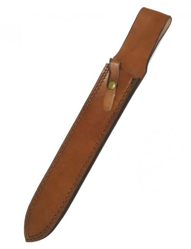 Il pocède une garde en acier pour plus de sécurité et est vendu avec un fourreau en cuir marron disposant d’un passage pour l’accroche à la ceintutre.