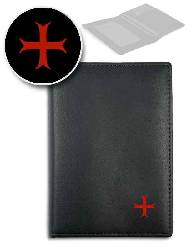 Porte-papiers en cuir noir, avec une croix templi�re rouge.