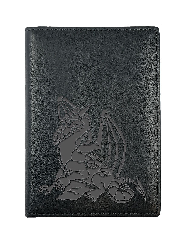Porte-papiers en cuir noir avec couverture gravée : Dragon Squelette.