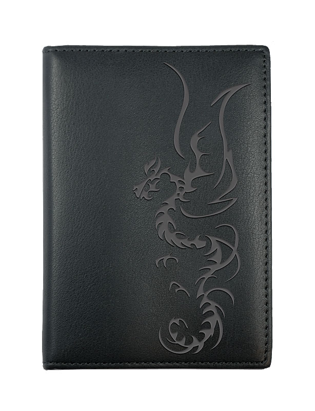 Porte-papiers en cuir noir avec couverture gravée : Dragon tribal.