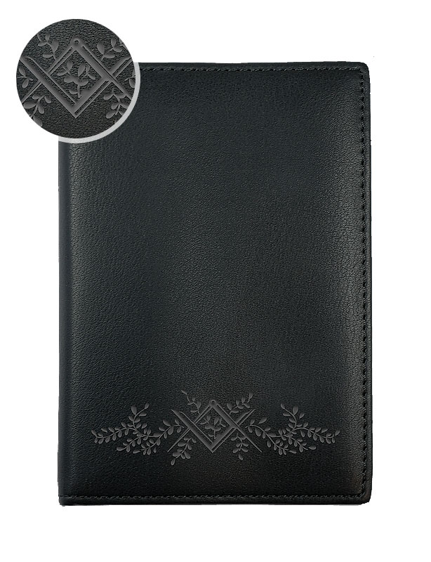 Porte-papiers en cuir noir avec couverture gravée : Équerre compas et branche d'acacia.