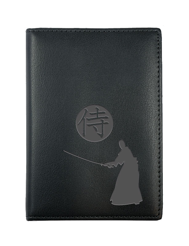 Porte-papiers en cuir noir, couverture gravée : Samouraï.