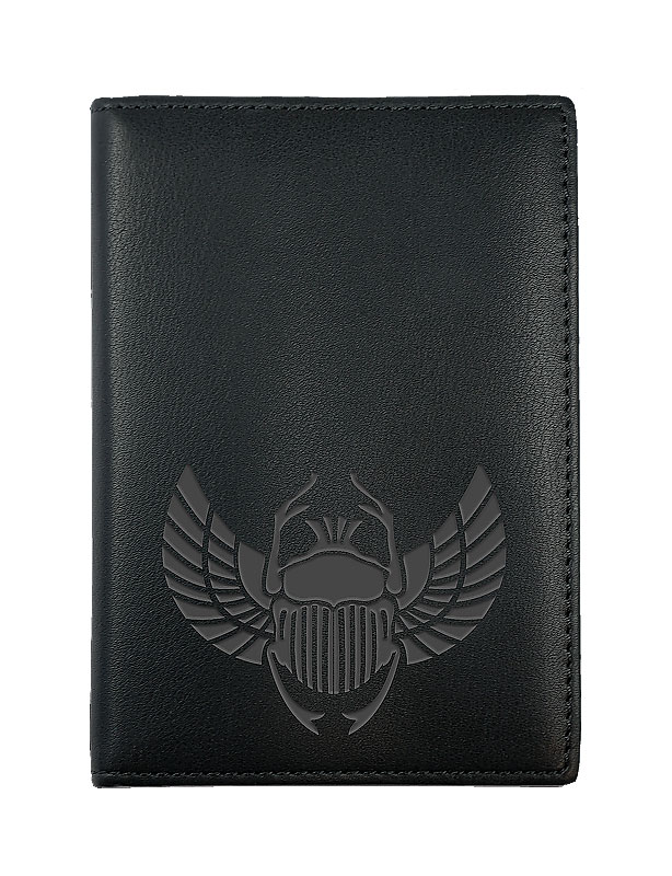 Porte-papiers en cuir noir avec couverture gravée : Scarabée ailé.
