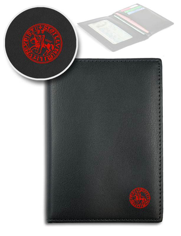 Porte-papier en cuir noir, avec Sceau des chevaliers templiers à fond rouge.