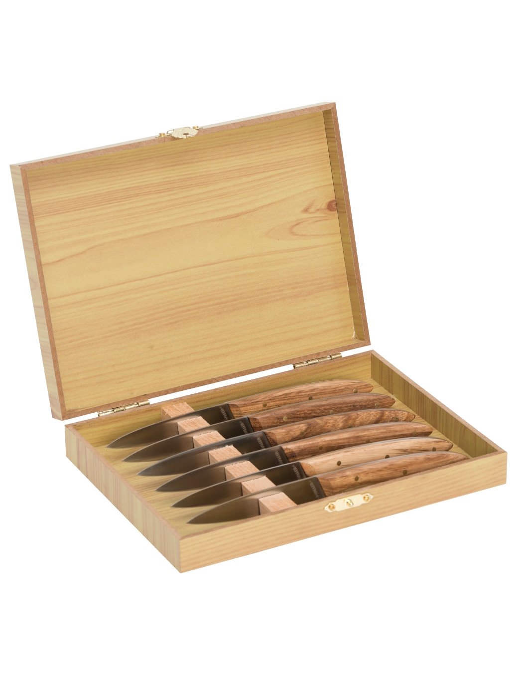 Le manche en bois de Zebrano, avec ses veinures naturelles uniques, confère à chaque couteau un caractère noble et une prise en main agréable. Les lames en acier inoxydable 440 assurent une découpe précise et durable, transformant chaque repas en une expérience raffinée.