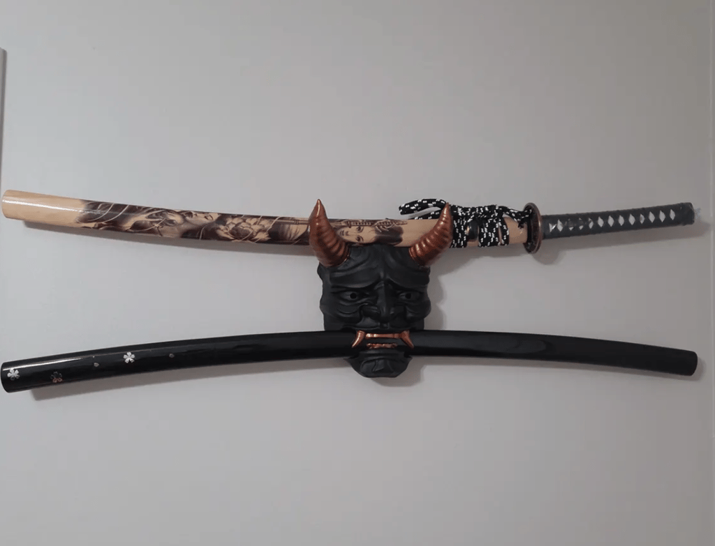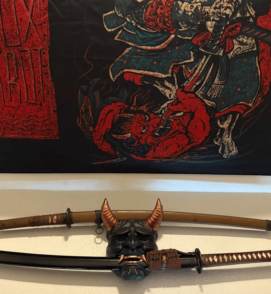 Mise en valeur spectaculaire : le masque Oni transforme votre katana en pièce maîtresse décorative