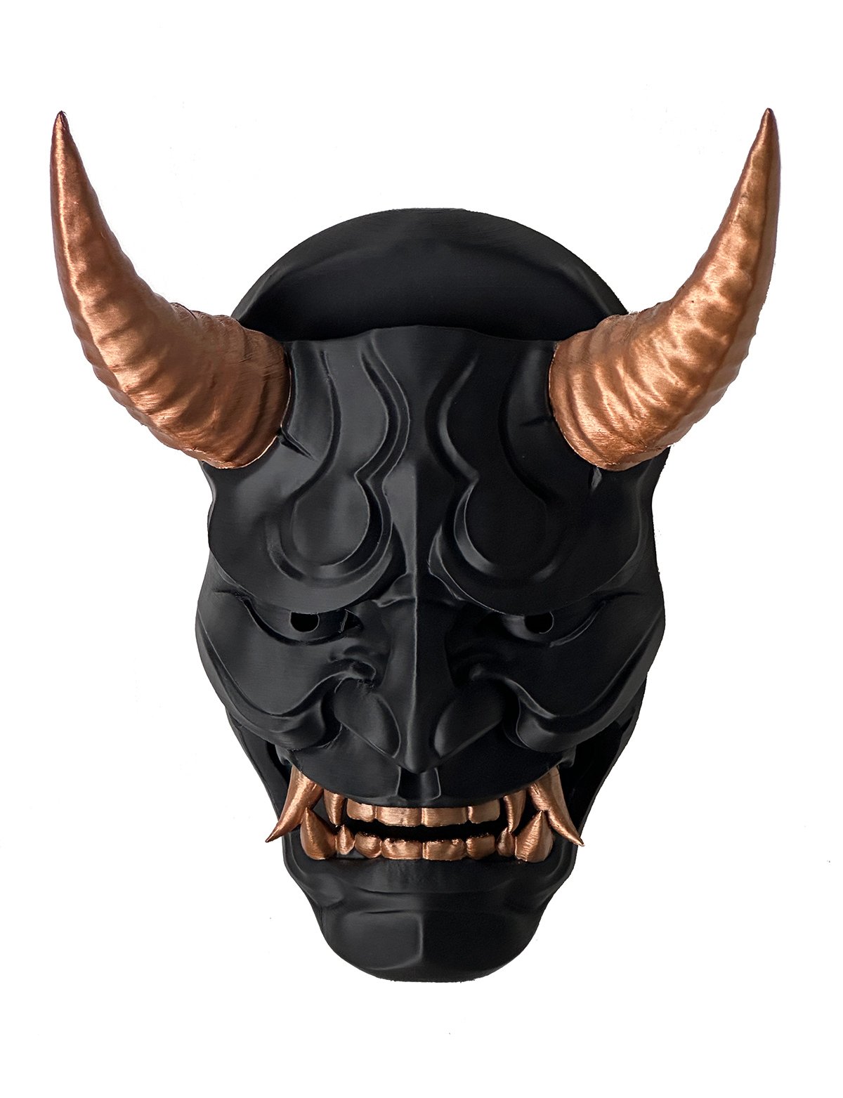 Un visage Oni détaillé : cornes sculptées, traits marqués, expression intimidante