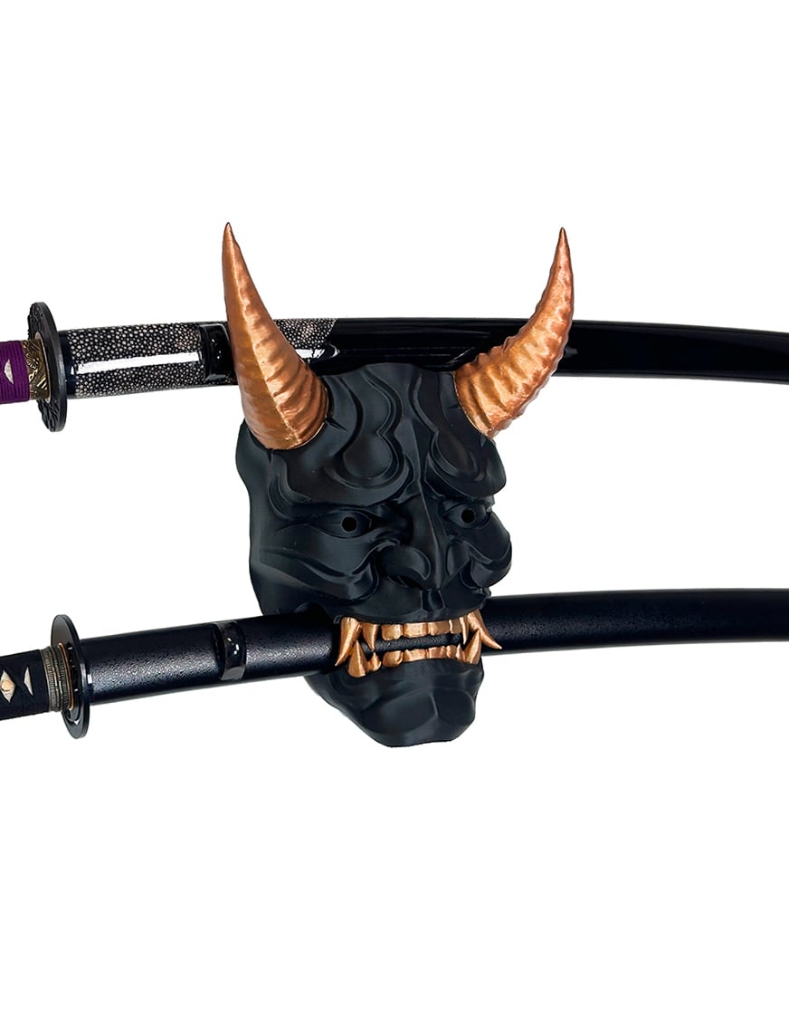 Dans la tradition japonaise, le masque Oni (démon) incarne à la fois la force, la protection et l’effroi. Portés autrefois pour repousser les mauvais esprits, ces visages terrifiants ont orné armures et rituels. En installant un support katana en forme de masque Oni, vous ne faites pas que présenter une lame : vous lui donnez une présence symbolique, comme un gardien ancestral veillant sur votre collection.