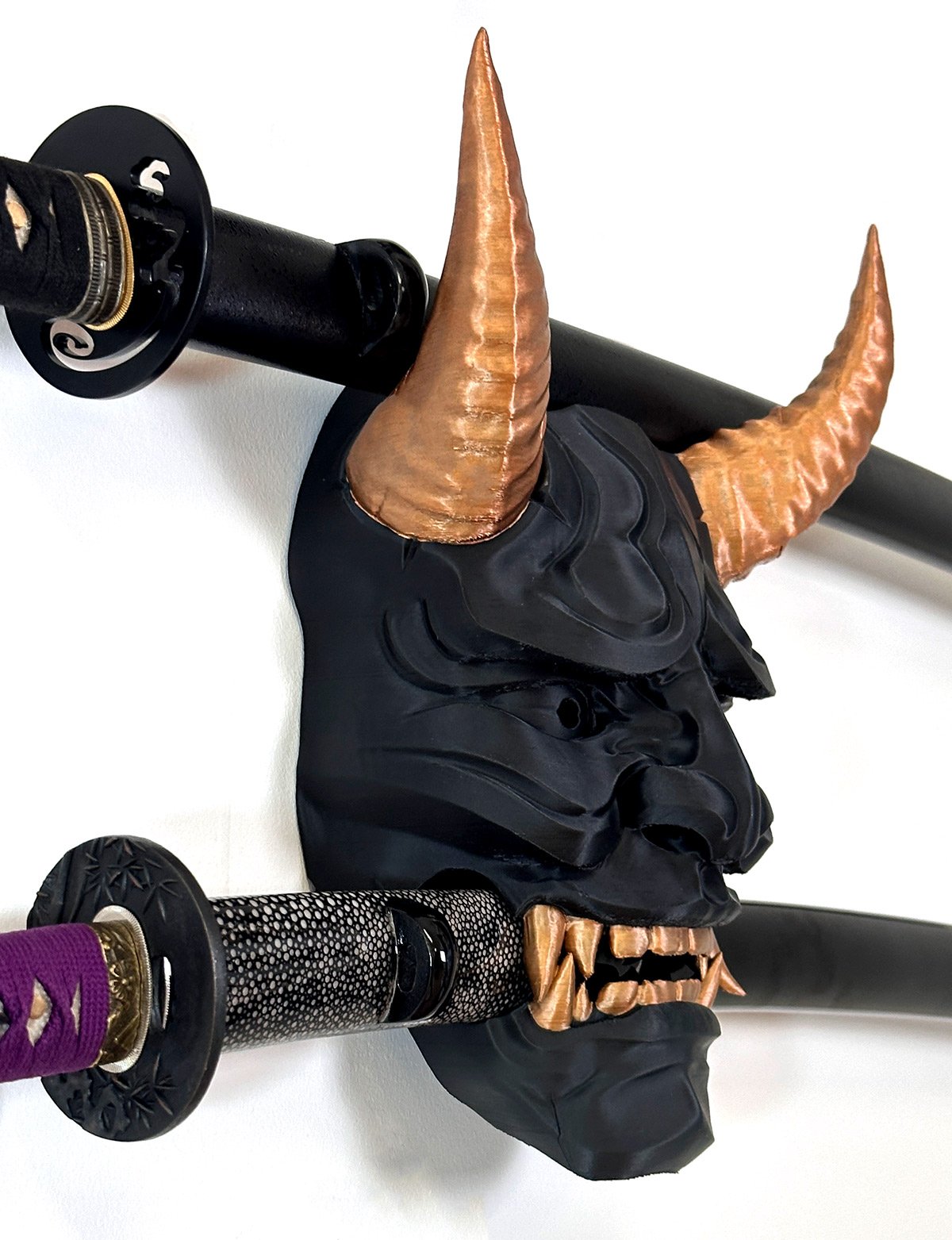 Offrez à votre lame un écrin digne de son histoire : le Support 2 Katanas « Masque Oni » allie puissance visuelle et solidité.