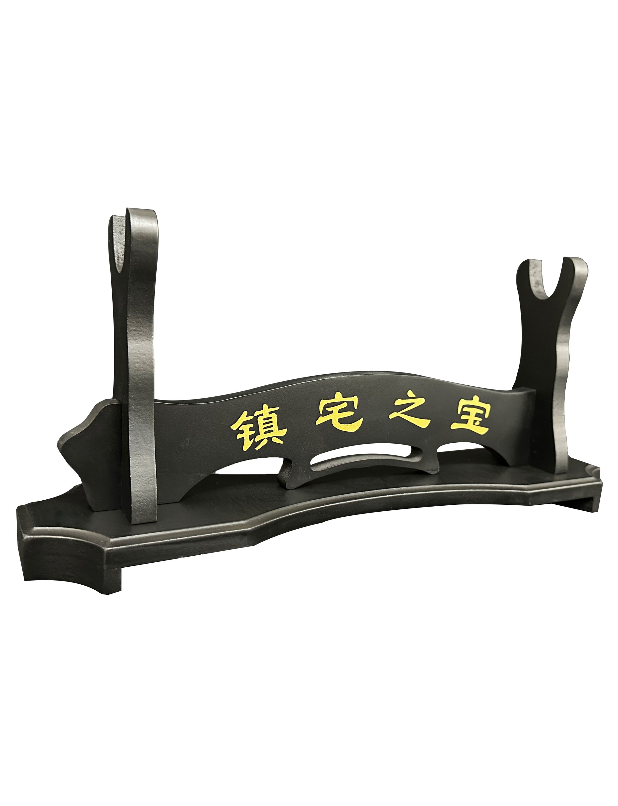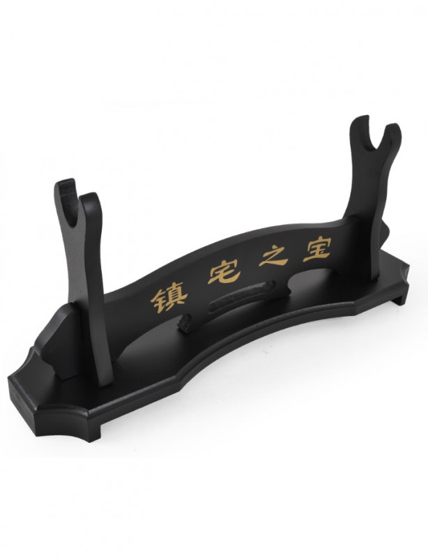 Ajoutez une touche d’élégance japonaise à votre collection avec ce support gravé de kanjis dorés. Conçu pour accueillir un katana ou un wakizashi, ce support est un élément essentiel pour mettre en valeur vos épées. Facile à assembler en trois pièces, il offre une stabilité idéale. Son design noir mat rehausse la gravure dorée « Zhen zhai zhi bao » sur le socle, qui signifie « Trésor gardien de la maison ».