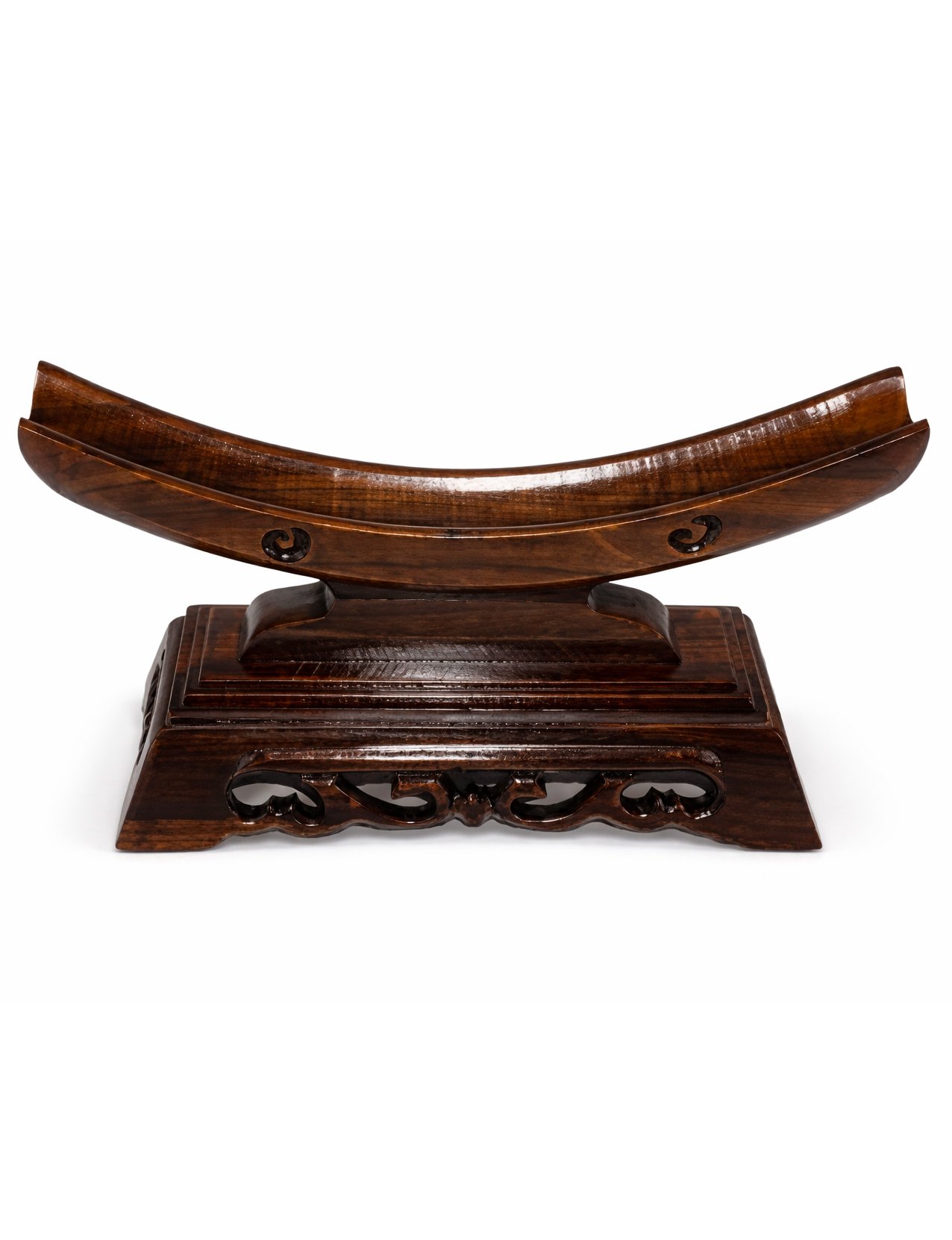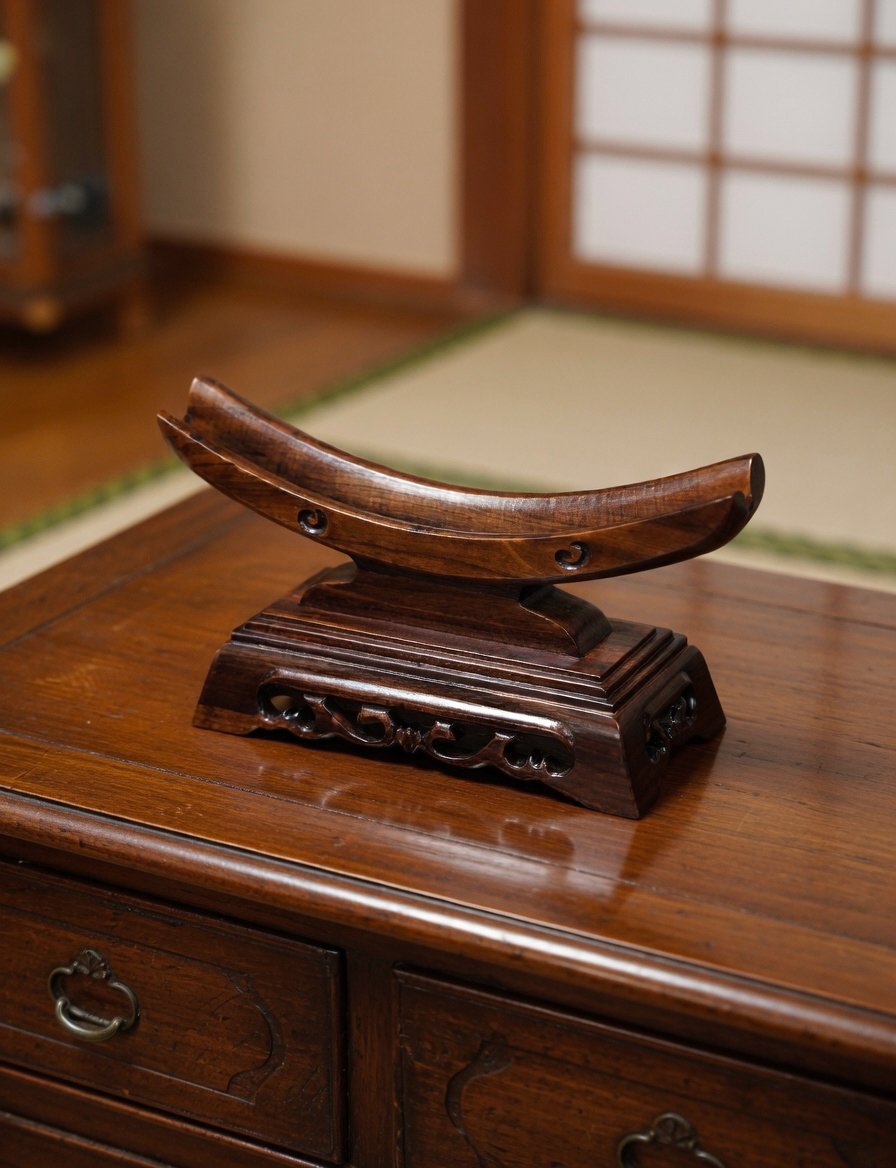 Au-delà de sa fonction première, ce support en bois foncé se distingue par ses gravures délicates, rappelant les motifs traditionnels japonais. Il s’intègre parfaitement dans une décoration intérieure sobre, zen ou inspirée de l’univers samouraï.
