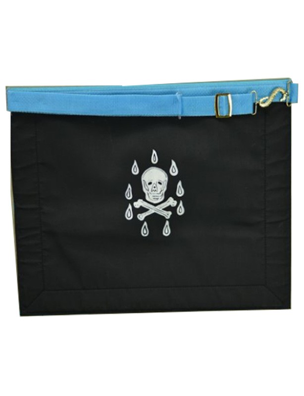 Dans le Rite Français, le tablier du Maître est riche en symboles, représentant les responsabilités, la connaissance et l’élévation spirituelle du porteur. Les motifs de crâne et de larmes, présents au dos de ce modèle, évoquent le cycle de la vie et de la mort, un rappel des enseignements fondamentaux du grade de Maître.
