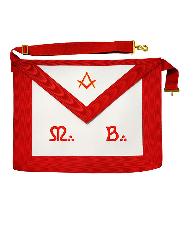 Les broderies en doré sur fond rouge arborent les lettres M:.B:., ainsi que l’équerre et le compas, symboles du discernement et de la rigueur dans la construction intérieure du Maître.