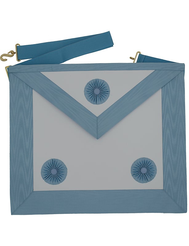 Tablier maçonnique de Maître, en cuir synthétique, avec bordures et 3 cocardes bleues.