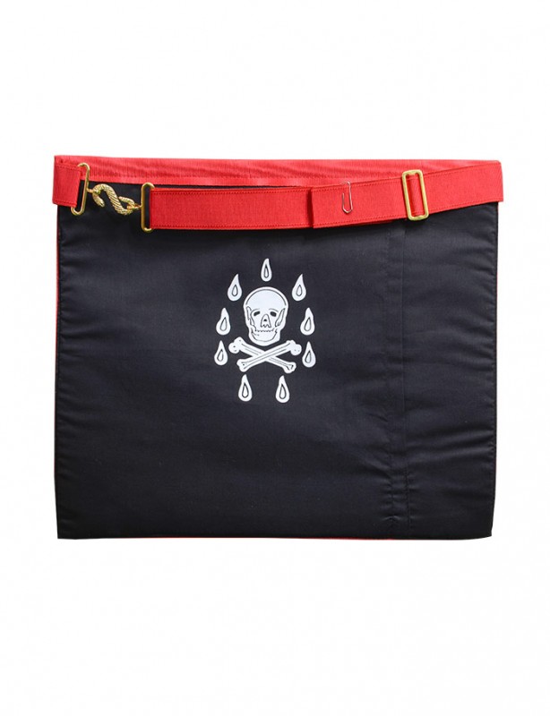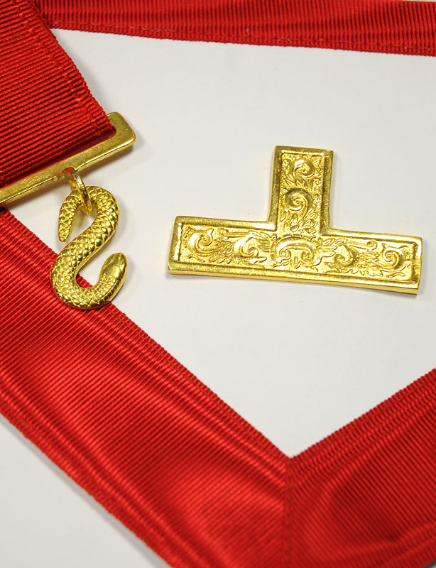 Tablier maçonnique de Vénérable Maître, en cuir véritable, avec bordures rouges et trois tau en métal doré ornementé.