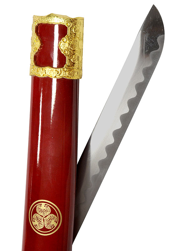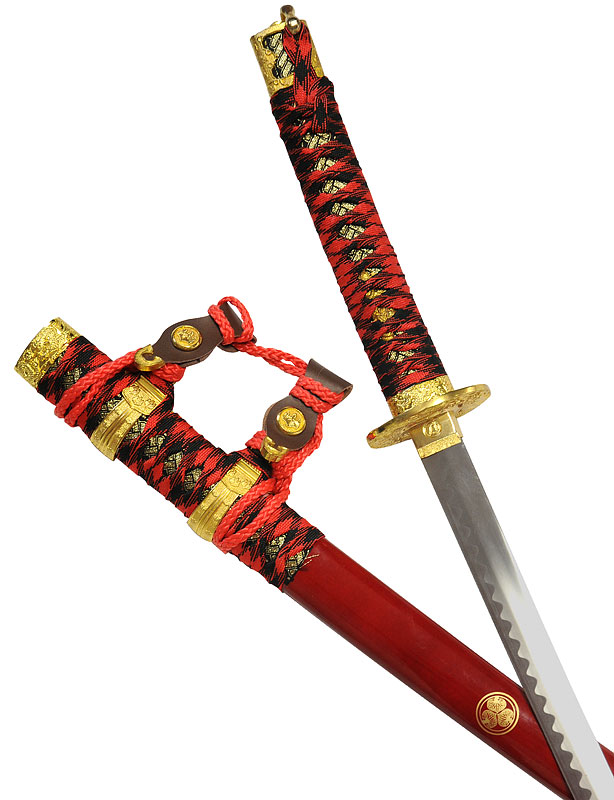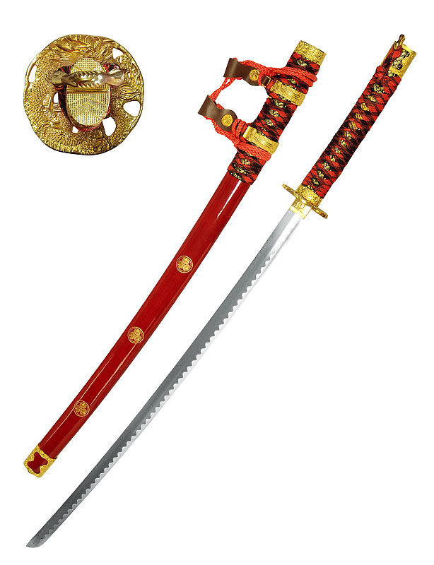 Ito rouge et noire. Saya en bois laqué rouge, avec peintures dorées.
