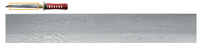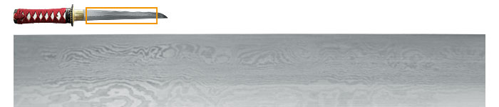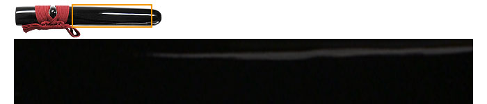 - Poignée (tsuka – 柄) : 11 cm en galuchat (peau de raie) recouvert d’un tressage rouge.