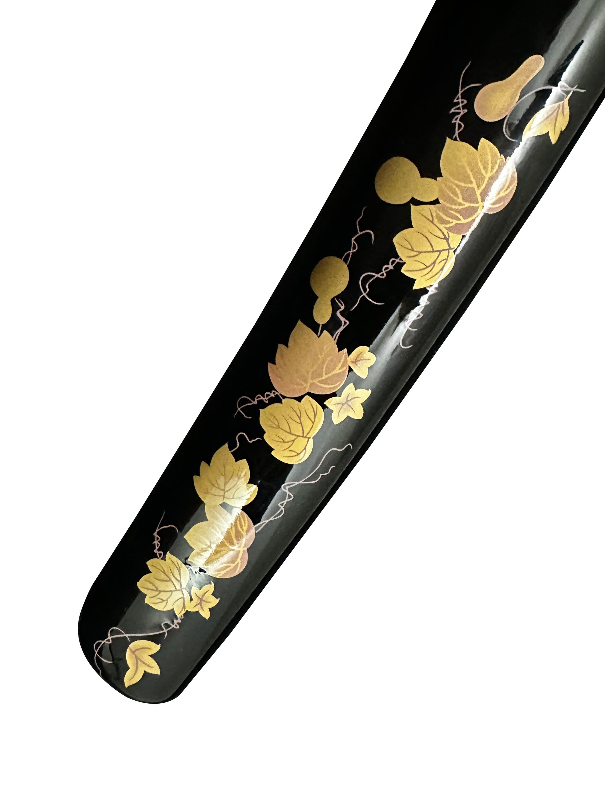La tsuka gainée de peau de raie blanche, enveloppée d’un ito en coton noir, offre une prise traditionnelle, confortable et instinctive. Le saya en bois laqué noir sérigraphié, muni d’un sageo beige, compose un contraste visuel sobre et sophistiqué, idéal pour un affichage sur support ou en vitrine.