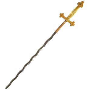 Contrairement à l’épée classique à lame droite utilisée autrefois par les Frères, l’épée flamboyante du Vénérable Maître se distingue par sa lame ondulée, rappelant la flamme, la foudre et la lumière. Elle n’est pas une arme de guerre : elle est un outil d’illumination, de création et de transmission.